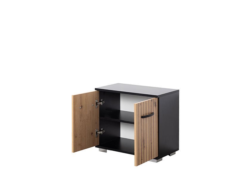 Tačan naziv dezena: korpus iverica crna, front iverica artisan. Komoda KING 2V se sastoji od zatvorenog pregradnog dela smeštenog u dva krila. Zahvaljujući praktičnosti lako se uklapa u sve ambijente savremenog doma.