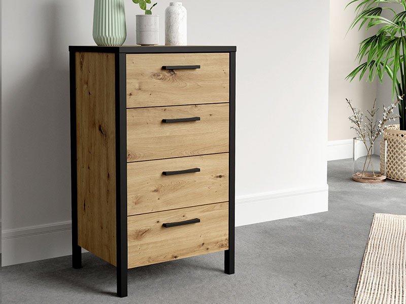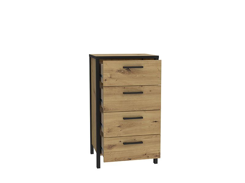 Tačan naziv dezena: korpus iverica artisan/ram crni, front iverica artisan. Komoda KIRIKUS 4F idealna je kao dodatni komad nameštaja za odlaganje, kako u ambijentu spavaće sobe, tako i u ostalim ambijentima doma – predsoblju, trpezariji, dnevnoj ili dečijoj sobi. Sastoji se od četiri funkcionalne fioke.