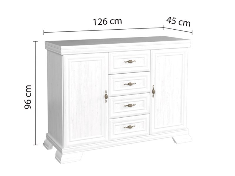 Tačan opis dezena je: korpus/front iverica Sosna Andersen. Model komode KORA 2 KK3 sadrži dva peagradna zatvorena dela i četiri fioke između njih. Deo je odgovarajuće kompozicije za opremanje ambijenata dnevnog boravka.