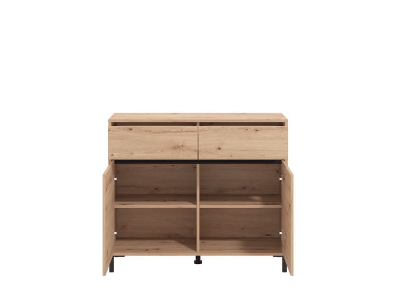 Komoda MARRON 106 2K2F2V u kombinaciji artisan hrast dekora sa crnom mat folijom, funkcionalni je komad nameštaja koji je potreban svakom ambijentu doma.