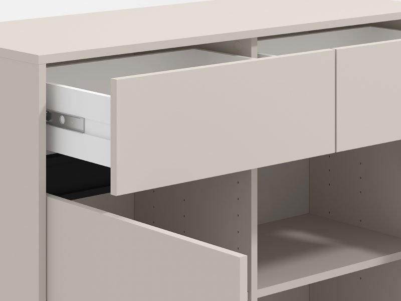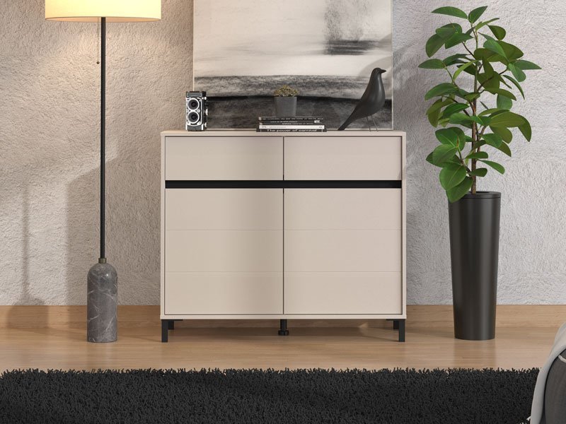 Komoda MARRON 106 2K2F2V u kombinaciji kašmir dekora i crne mat folije funkcionalni je komad nameštaja koji je potreban svakom ambijentu doma. Odlično raspoređen upotrebni prostor ove komode čine dva zatvorena pregradna dela i dve praktične fioke.