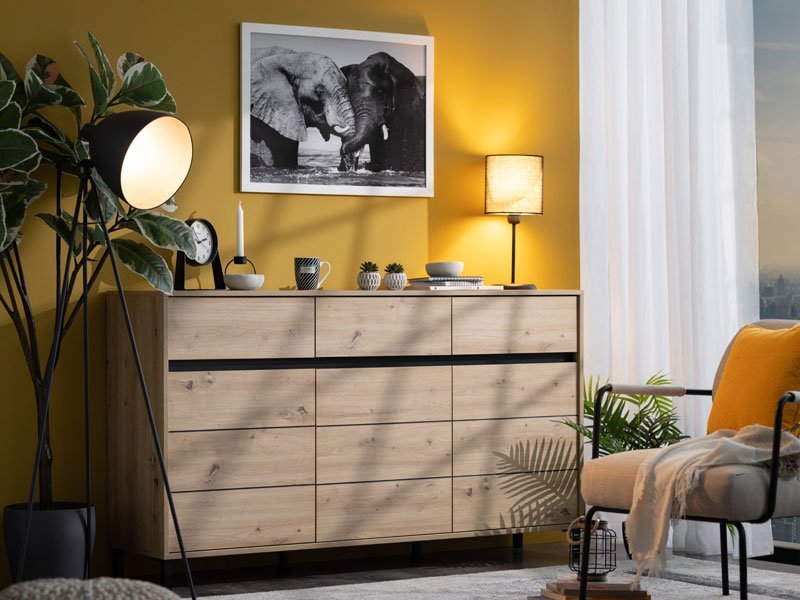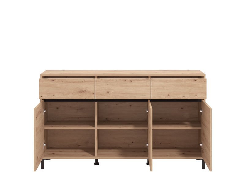 Komoda MARRON 157 3K3F3V u kombinaciji artisan hrast dekora sa crnom mat folijom, funkcionalni je komad nameštaja koji je potreban svakom ambijentu doma.