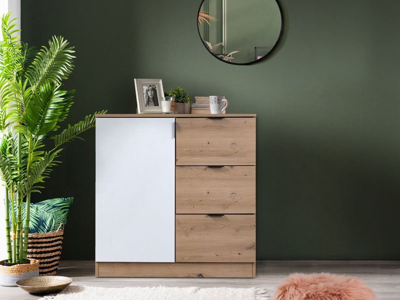 Tačan naziv dezena: korpus iverica artisan, front iverica bela artisan. Komoda MONT 1V3F idealna je kao dodatni komad nameštaja za odlaganje, kako u ambijentu spavaće sobe, tako i u ostalim ambijentima doma – predsoblju, trpezariji, dnevnoj ili dečijoj sobi. Sastoji se od prostranog pregradnog dela, a poseduje tri funkcionalne fioke.