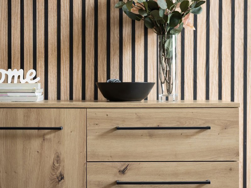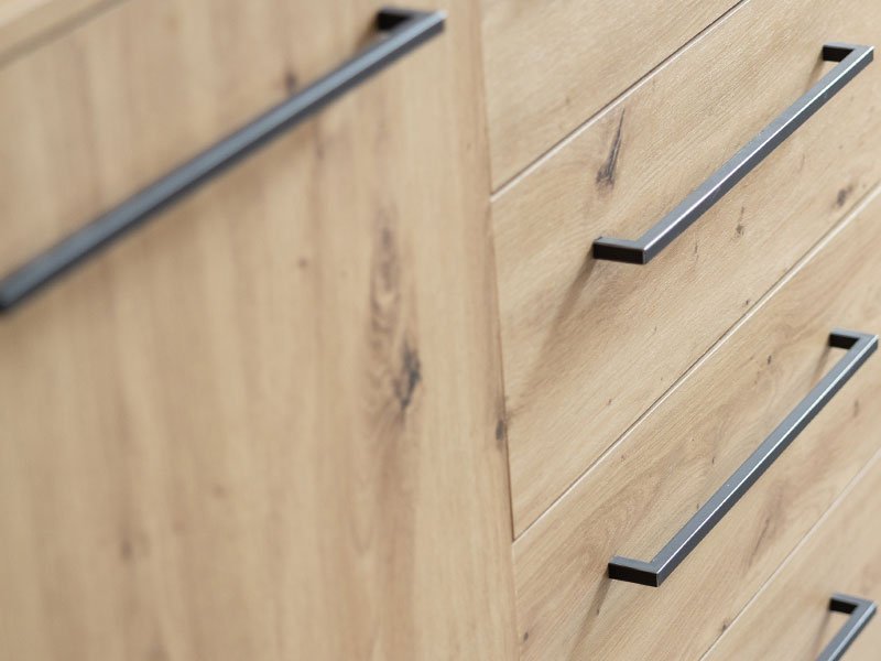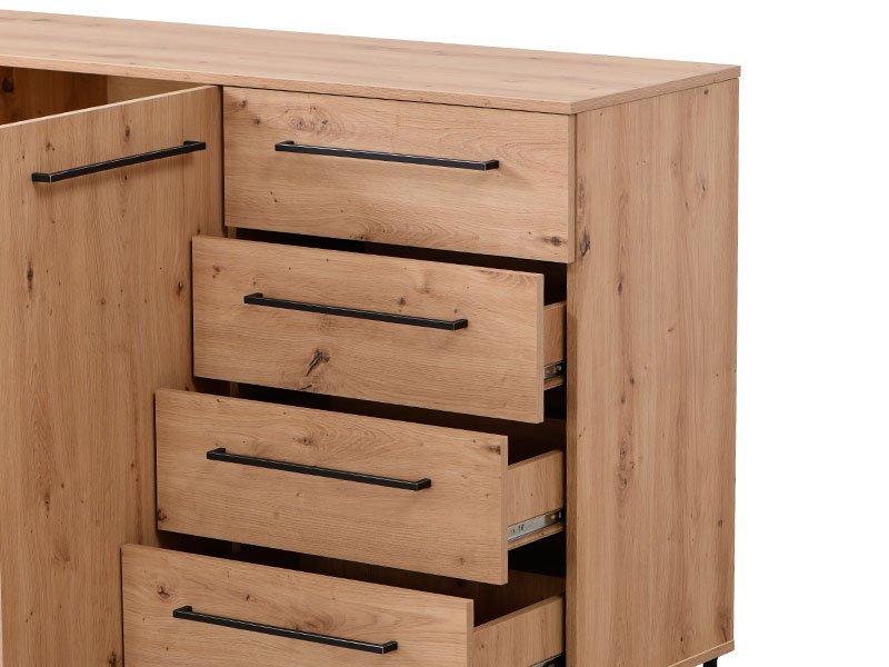 Komoda SARDINIA 3K4F, je spoj topline naturalnog i rustičnog artisan hrasta sa primesama suptilnih crnih elemenata dekora, kao karakteristike industrijskog stila u dizajnu enterijera. Sastoji se od dva segmenta sa pregradnim policama, kao i četiri funkcionalne fioke. Deo je istoimene kolekcije SARDINIA sa kojom čini enterijersku celinu, a koja u vaš dom unosi odraz autentičnog i odvažnog životnog stila.