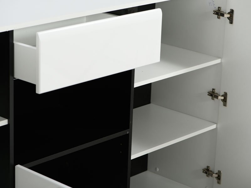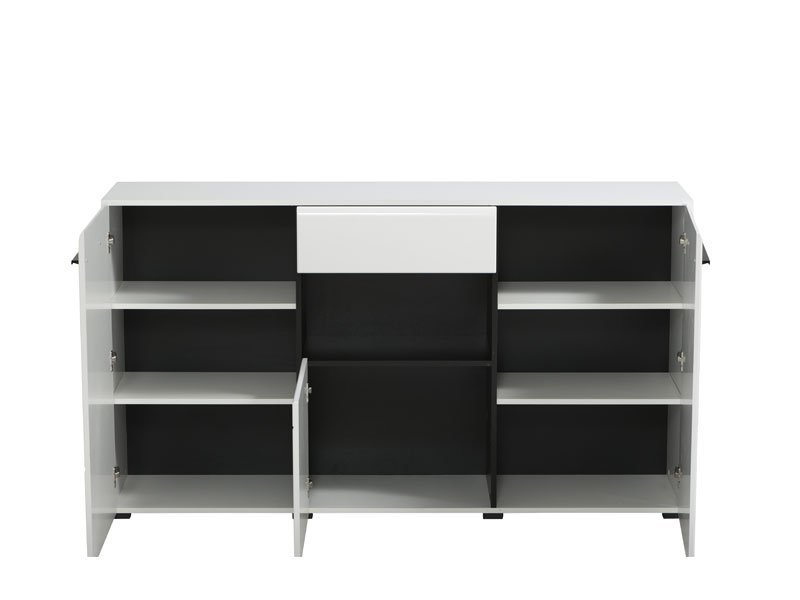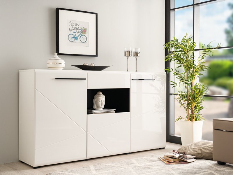 Komoda TRENTINO 3K1F, u kombinaciji opak bele i crne sa frontovima presvučenim belom lak folijom sa 3D aplikacijama, deo je sistema elemenata TRENTINO čiji dizajn i funkcionalnost doprinose praktičnim i estetski autentičnim rešenjima za opremanje enterijera. Sastoji se od tri zatvorena dela sa unutrašnjim pregradama i jedne fioke.