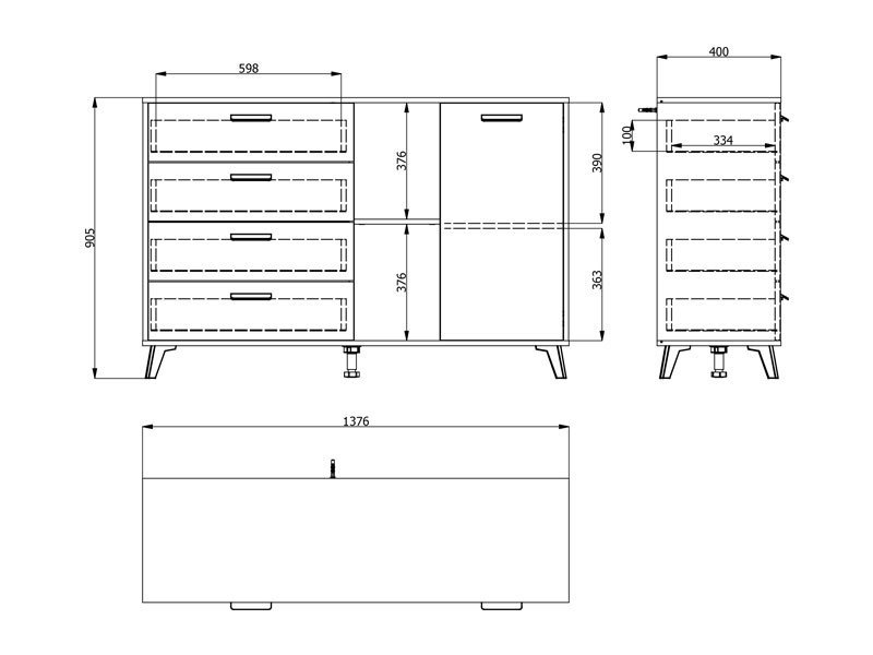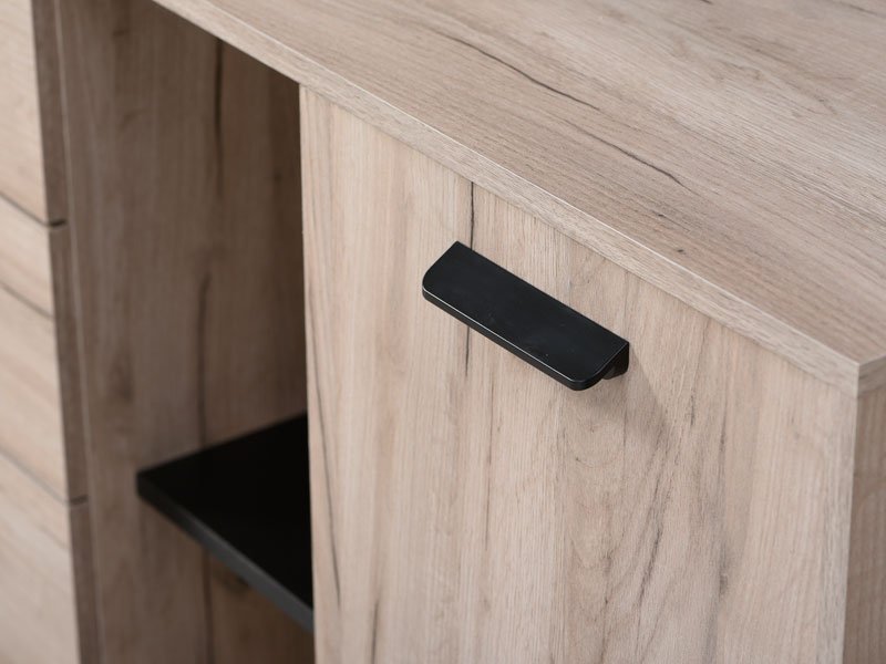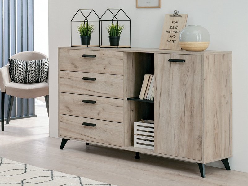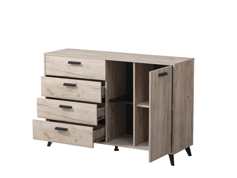 Komoda UMBRIA 3K4F, u kombinaciji dekora sivog hrasta i crnog drveta, deo je istoimene kolekcije koja će doprineti da vaš dom bude opremljen po najnovijim enterijerskim standardima. Sastoji se iz tri dela koja čine 4 prostrane fioke, kao i jednokrilni i otvoreni frontalni deo sa unutrašnjim pregradama. Zbog svoje funkcionalnosti, idealno će se uklopiti u vašu spavaću sobu, dnevni boravak ili predsoblje.