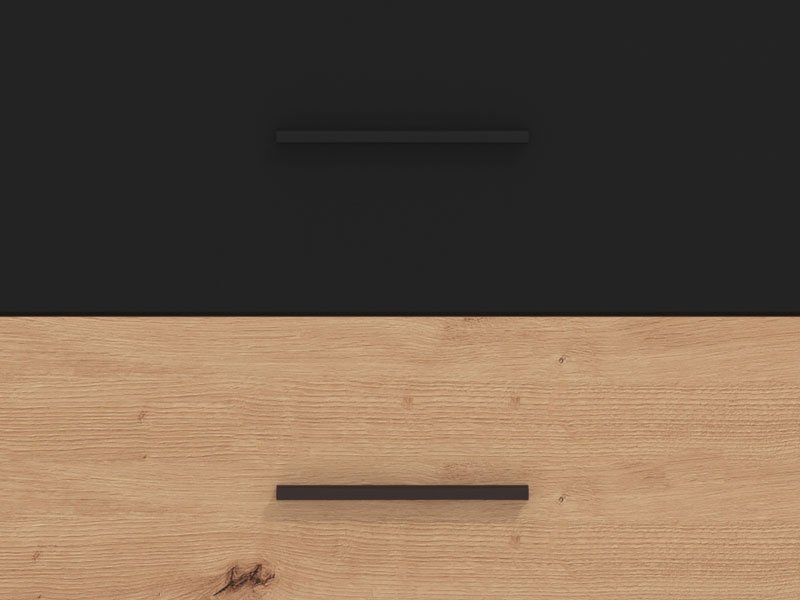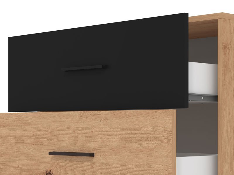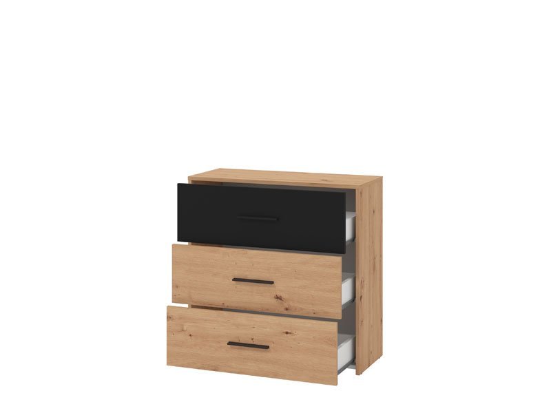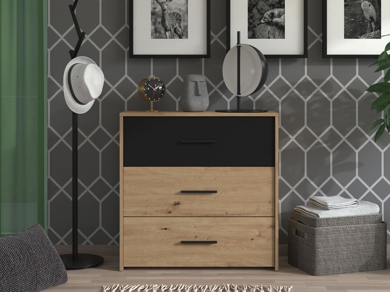 Komoda VARADERO 3F, u dekoru artisan hrasta i crne, deo je istoimene kolekcije elemenata dečije sobe. Ne zauzima mnogo prostora, a veoma je funckionalna. jer poseduje tri fioke i može biti idealna dopuna garderobnom delu.