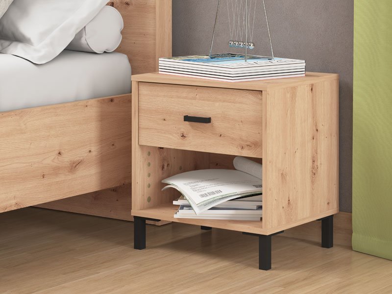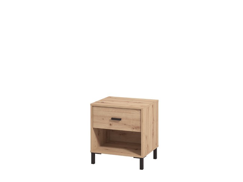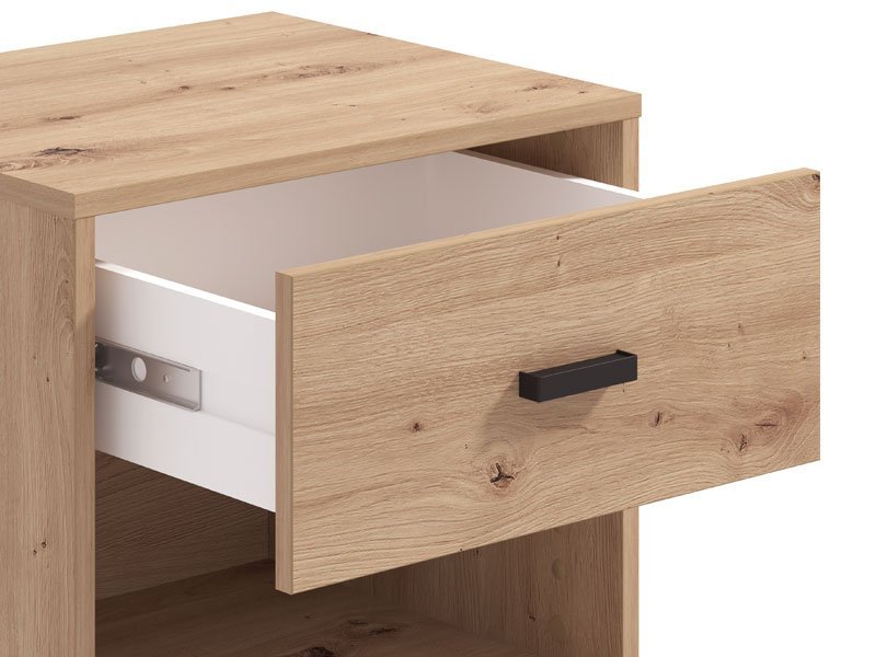 Noćni ormarić ALERIA NO1F, u dekoru artisan hrasta, doprinosi praktičnom uređenju spavaće sobe i svojim neutralnim dizajnom se može uklopiti u različite ambijente spavaćih soba. Sastoji se od jedne fioke i jedne police za odlaganje. Deo je je istoimenog sistema elemenata za opremanje spavaće sobe ALERIA.