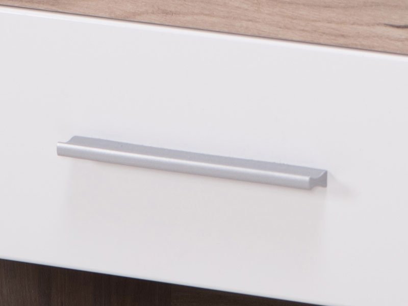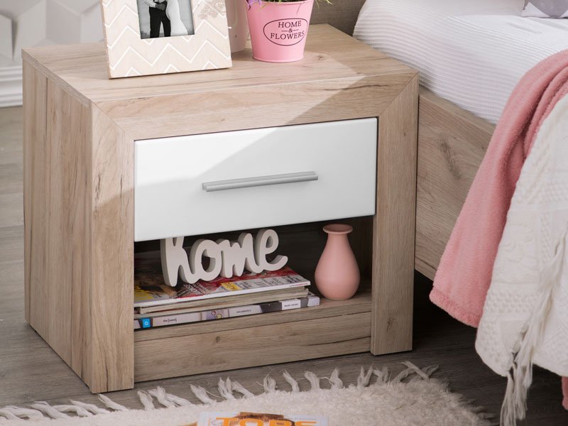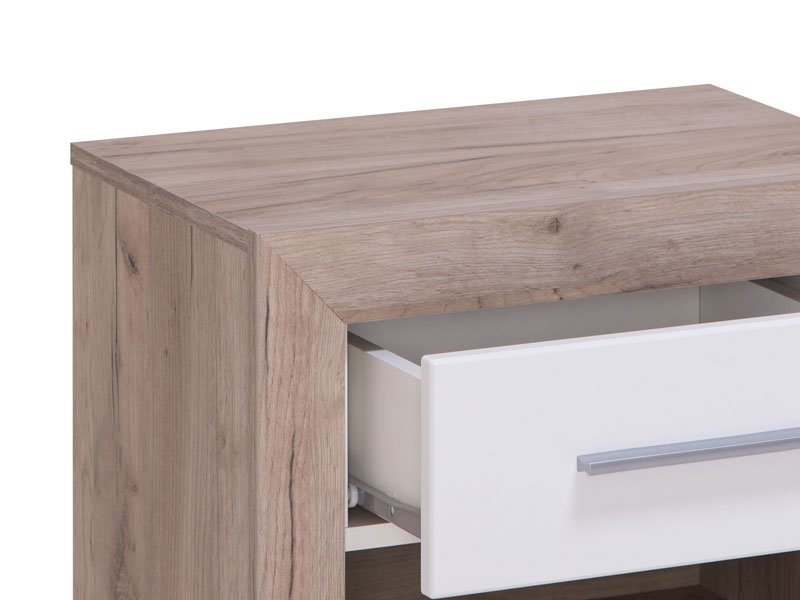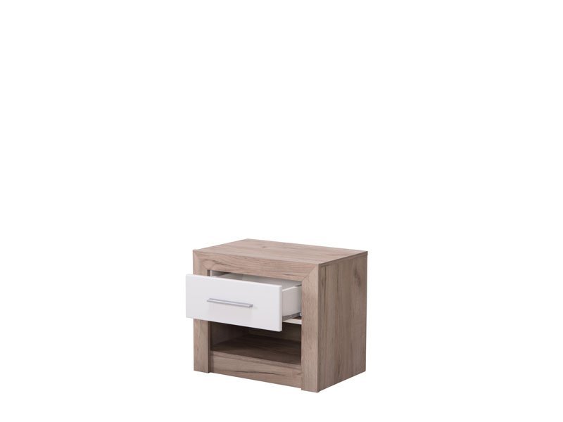Noćni ormarić ASTOR NO1F, sa kombinacijom dekora sivog hrasta i frontalnog dela presvučenog belom lak folijom, poseduje praktičnu fioku i otvoreni deo za omiljene stvari koje volite da su vam pri ruci. Deo je istoimene kolekcije koja svojim estetskim karakteristikama, uz širi profil rama, MDF horizontalne aplikacije na frontovima i mat ručice, zaokružuje čitavu enterijersku celinu kada je u pitanju opremanje spavaće sobe.