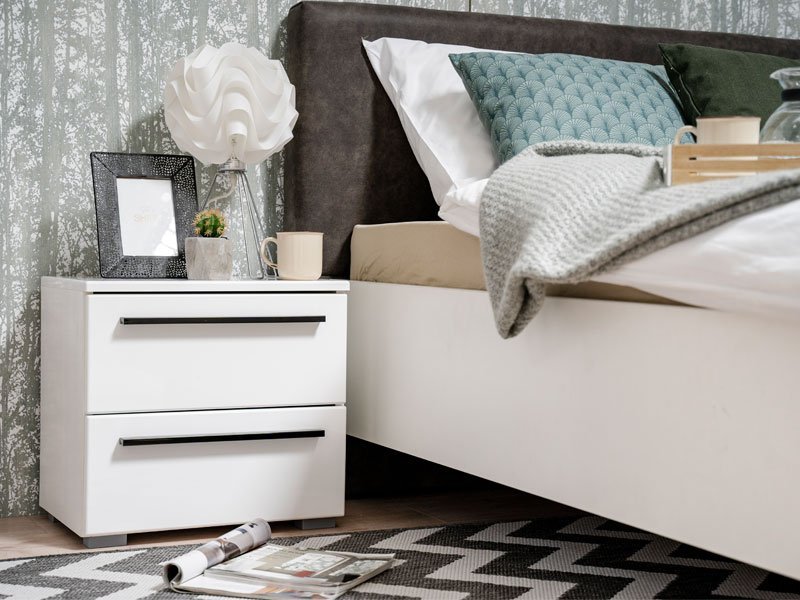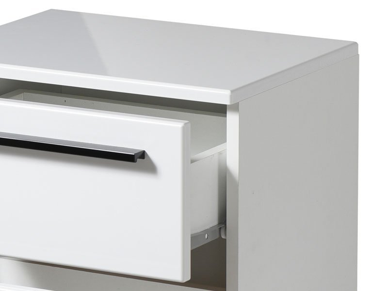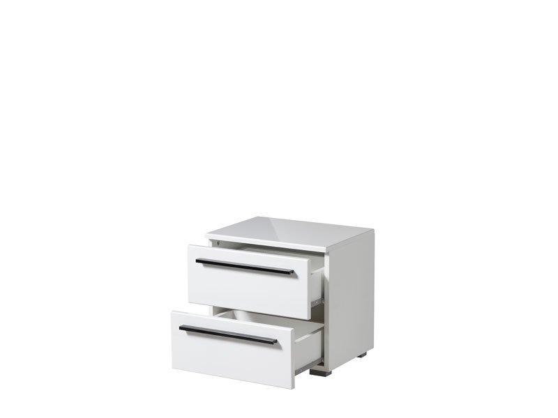 Noćni ormarić KSANTI NO2F, u opak belom dezenu sa frontovima presvučenim belom lak folijom, deo je istoimene kolekcije elemenata spavaće sobe. Noćni ormarić KSANTI N02F ima dve praktične, vertikalno smeštene fioke.