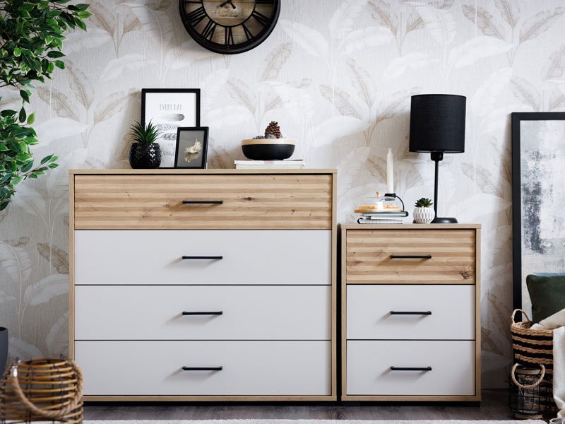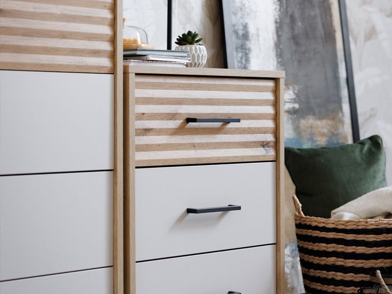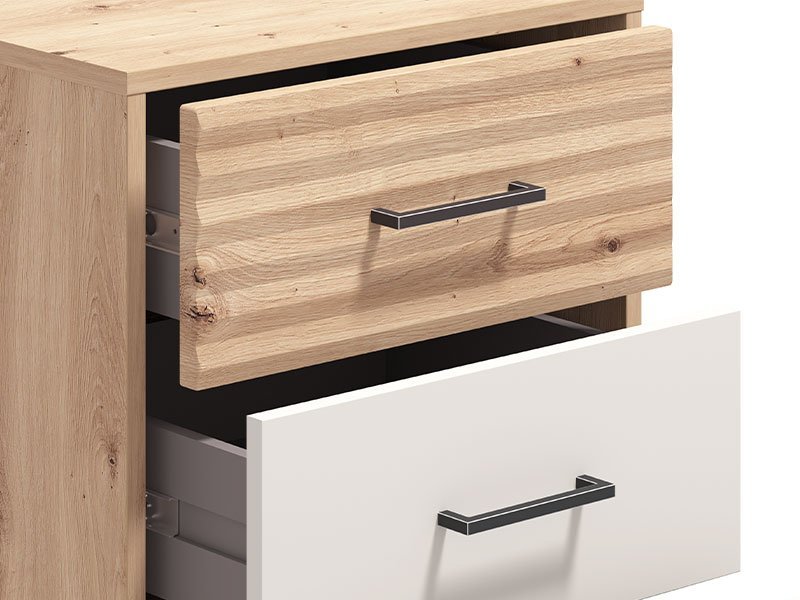 Noćni ormarić MODENA NO3F u kombinaciji dekora artisan hrasta, artisan hrast folije i kašmir dekora, predstavlja spoj funkcionalnog i moderno dizajniranog komada nameštaja koji je neophodan i veoma praktičan element u svakom ambijentu spavaće sobe. Upotrebni prostor noćnog ormarića čine tri praktične fioke. Deo je istoimenog sistema elemenata za opremanje spavaće sobe MODENA, moderne dizajnerske forme.
