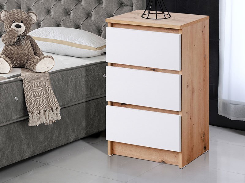 Tačan naziv dezena: korpus iverica artisan, front iverica bela sjaj. Noćni ormarić SEA 3F je inovativni model noćnog ormarića, praktičnog dizajna, sa tri smeštene fioke. Funkcionalan je deo spavaće sobe i doprinosi estetici ambijenta.