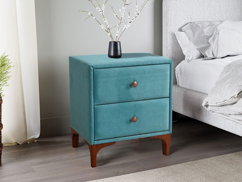 Tačan naziv dezena: korpus/front štof tirkiz vera 89, ručice/nogar braon. Noćni ormarić SERYA je estetski privlačno i praktično rešenje za dodatak spavaćoj sobi. Upotrebni prostor čine dve praktične fioke obogaćene sa braon ručicama, a koje su usklađene sa nogarima noćnog ormarića.