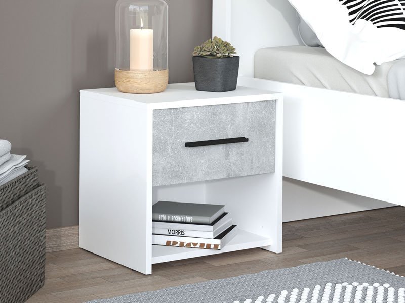 Noćni ormarić VARADERO 2NO1F, u dekoru opak bele i betona, deo je istoimene kolekcije elemenata dečije sobe. Idealna je dopuna spavaćem krevetu i doprinosi praktičnom uređenju ambijenta. *Napomena: Cena je za paket od dva noćna ormarića.